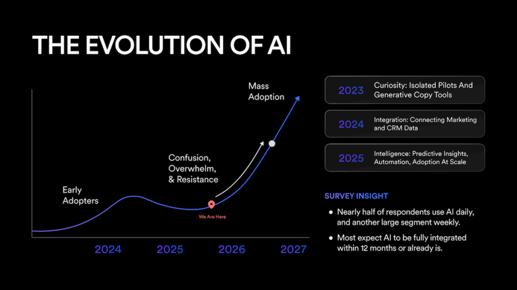 The next phase of AI adoption moves beyond executing tasks to predicting opportunities. Dashboards will replace reports. Systems will suggest next best actions instead of summarizing the past. Marketing performance will guide strategy in real time, not after the fact.